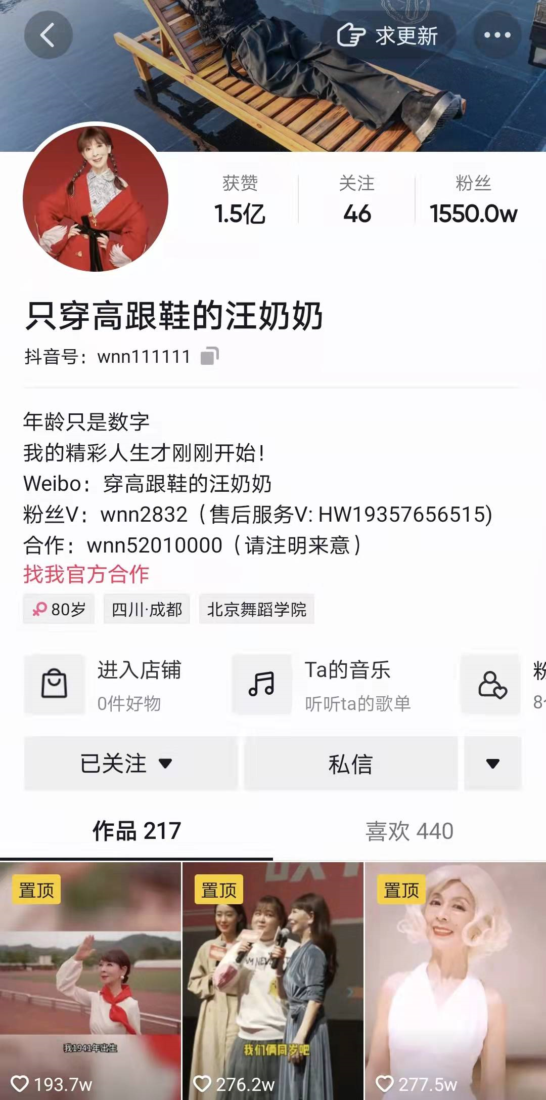 凭借着优雅的生活态度和舞蹈才艺,汪奶奶在抖音发布了217个作品,获赞1.5个亿,粉丝超1500w。
