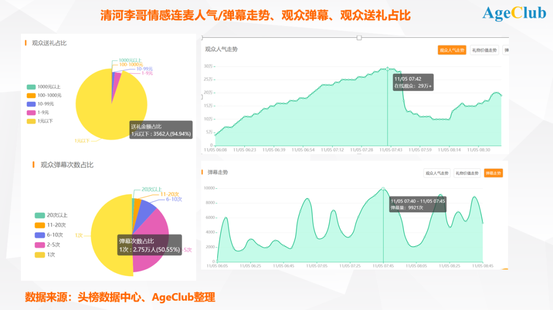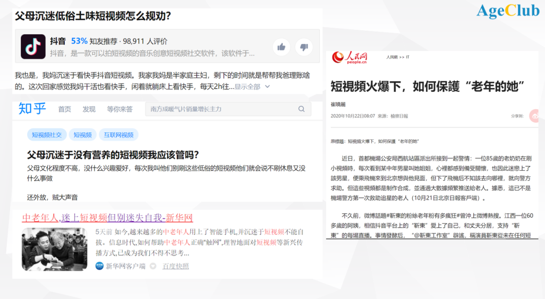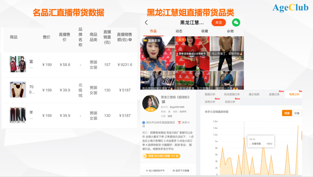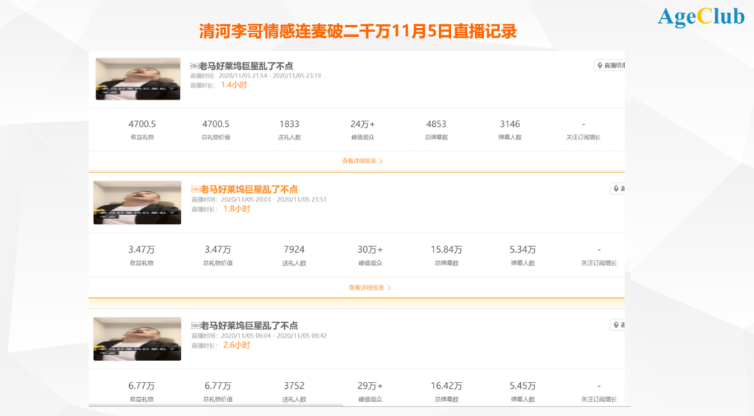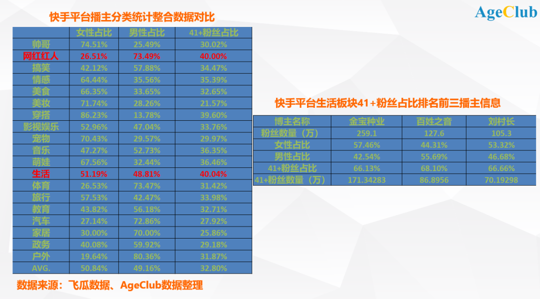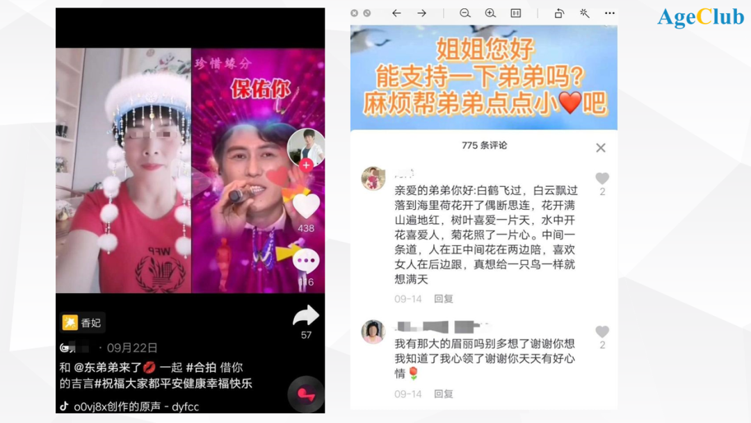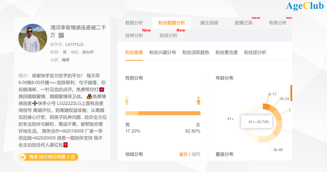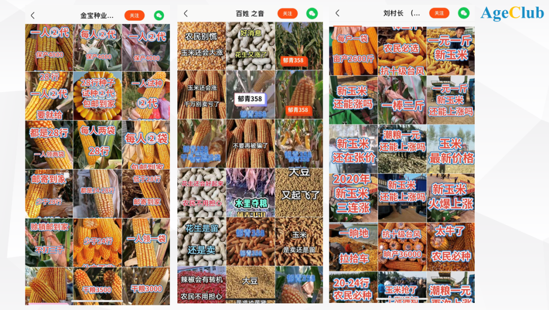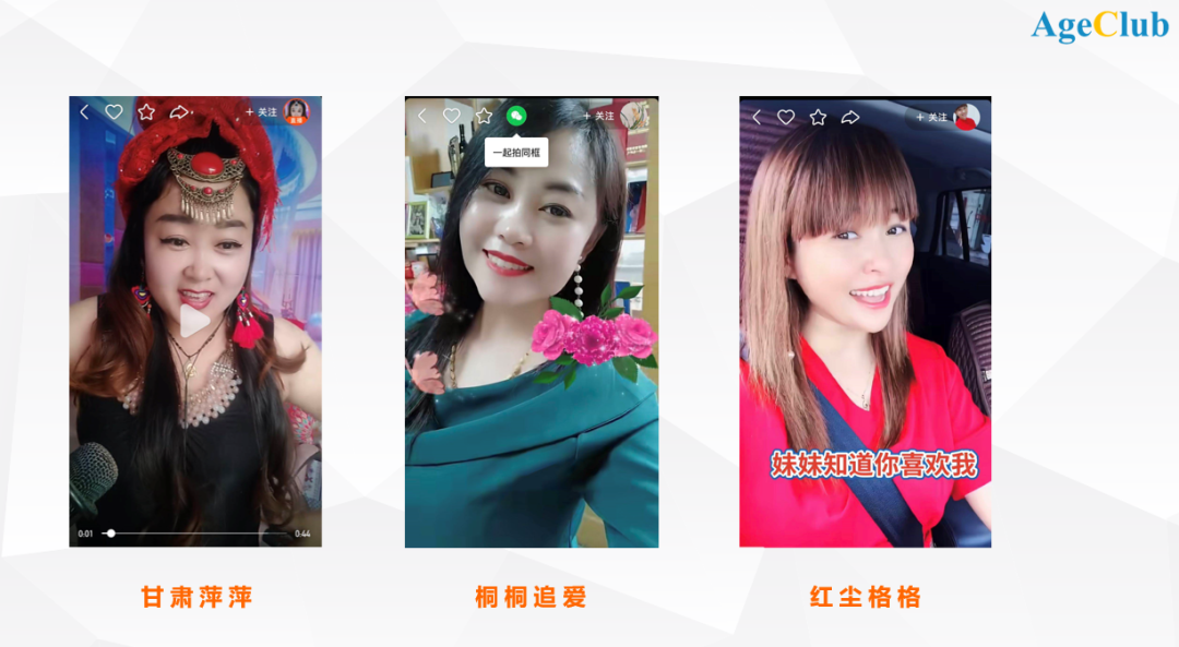 AgeClub线下活动预告丨2020中国老年行业创新发展系列论坛 深圳站,时间11月26日,文末扫码报名! 开篇: 网络时代的进步影响着这个社会的每一个个体,随着短视频的浪潮袭来,将所有智能手机用户卷入其中,也没有将中老年这个群体落下。 现在越来越多中老年人开始沉迷短视频,反映出来的是中老年人生活娱乐较为单一,缺少陪伴和交流的社会问题。“老年短视频防沉迷系统”、“父母沉迷抖音、快手等短视频APP,我们该不该管”等话题也频频成为知乎、微博等平台的热点,中老年人与短视频之间的交互越来越频繁,逐渐也吸引了各行各业的关注。 比如抖音和快手都将中老年用户作为未来增量的重点,新华网、中国经济家、人民网等官方主流媒体也纷纷呼吁正视“网瘾老年”群体,正视他们内心的精神需求,提供更多的可替代产品。 但是社会发展的太快,造成的代沟所需要的时间越来越短,他们究竟对什么感兴趣让全社会都感到困惑。 于是,AgeClub深入挖掘了快手19个行业上以41岁以上短视频用户(以下简称41+)为主要粉丝的播主信息,统计了各个类别的主要播主(大部分播主的粉丝数在100万以上)的内容特点,找到了其中三个最具特点的板块:网络红人、情感、生活。 除了《深扒200个抖音快手账号后,4亿银发人群的短视频粉丝数据告诉了我们什么》中发现的快手41+用户主要关注板块为音乐板块之外,在这些直播板块中又有新的发现: 中老年女性用户已经开始在短视频直播中产生了购买行为,带货播主受到中老年女性的追捧;中老年女性情感存在不稳定因素,对情感头部播主已经开始打赏;农产品板块精准吸引被市场所忽略的农村下沉市场中老年短视频用户,玉米相关的农产品视频最受关注。 PART 1. 网络红人板块中41+男女喜好偏差大 在主要观众为41+人群的“网络红人(唱歌)”板块中,男性粉丝比例平均占比为65.80%。而在“网络红人(舞蹈/服饰)”板块中,女性粉丝平均占比为82.56%。可见同样是在网络红人模块,41+男女偏好的网络红人之中又可以细分出其他特性,相比于女性更喜欢的是广场舞、服装,男性更喜欢唱歌。 而其他细小分类比如“网络红人(搞笑)”、“网络红人(相亲)”、“网络红人(卖茶)”等等由于播主数量少、粉丝量小等原因暂不列入讨论。 AgeClub分别收集了“网络红人(唱歌)”和“网络红人(舞蹈/服饰)”两大板块有代表性的播主,并分析了他们的视频主要特点,罗列如下。 01、网络红人(唱歌) 快手上的网络红人“桐桐追爱”(男性占比为68.54%,41+粉丝占比为69.11%)、“甘肃萍萍”(男性占比为62.84%,41+粉丝占比为68.73%)、“红尘格格”(男性占比为74.67%,41+粉丝占比为66.51%),相比于传统的网络美女播主和传统的快手上的音乐播主,这些网络红人有以下特点: 中年女性。相比于其他年龄段,41+男性用户更青睐于中年女性,随着年龄的增长,他们的喜好也会跟着发生变化,在35-40岁左右的女性,更容易吸引这个市场的男性用户。 歌曲的选择为老歌。中老年男性用户更喜欢老歌,比如常回家看看、家和万事兴、多年以后,这种长期上榜春节晚会的歌曲,相比于其他流行歌曲,更容易受到41+群体的钟爱。 直播画面鲜艳。很多人都在微信群聊里都接收过长辈推送的花花绿绿的链接和表情包,为了吸引这些高龄群体,这些播主或者在界面上搭配几朵花,或者在衣服选择更为鲜艳的颜色。比如播主“甘肃萍萍”,就是通过鲜艳的搭配以及独特的嗓音,吸引了210万粉丝,其中就有144万41+用户,且大部分(62.84%)为男性。 02、网络红人(舞蹈/服饰) 比如快手上的网络红人“茶茶曳舞(阿杜)”(女性粉丝占比为75.56%,41+粉丝占比为66.34%)、“独行侠曳舞搭配”(女性粉丝占比为91.33%,41+粉丝占比为75.87%),这些受众群体主要为41+女性用户群体的舞蹈教程都有以下特点: 简单易懂。教导舞蹈的老师们会将每一个动作都配上标记并且动作缓慢,更容易于高龄人群的学习和模仿,降低了中老年用户群体学习舞蹈的门槛。比如“独行轻舞”(直播教程如下图),就将舞蹈的每一个动作通过“数字+文字”的标记形式让学习过程变得更加容易。 多为比较受欢迎的广场舞。许多中老年人在外看到别人跳广场舞也想加入,也想学习,但是起步阶段会遭遇不熟悉或者一下子不适应在这么多人面前学习,短视频就提供了一个很好的平台,自己可以先在家里进行学习,达到一定熟悉程度后能够更好的融入外部的广场舞队伍。 在三四线城市以下,许多中老年女性用户面临着购买渠道少、衣服款式不新颖、价格高昂,而快手上一批带货播主就看准了这个消费市场,通过短视频的方式来销售中老年女性服装,与传统带货播主不同,这些面向41+群体的直播带货服饰的播主们在选择衣服的方面有以下几个特点: 价格优势。春夏款衣服普遍在几十元到两百元不等,而秋冬季衣服普遍在三百元以内。与市场上动辄几百上千的衣服形成鲜明的价格对比,也让没有学会用淘宝购物的中老年用户第一次体会到了电商所带来的价格红利。 款式偏中老年。这些受41+群体所追捧的短视频带货播主,选择的都是中老年女性比较喜欢的款式,款式稳重、大方,更加的适合41+女性群体。 播主试穿。其中以黑龙江慧姐为代表,她本身就是一位中年女性,通过她的亲自穿搭以及介绍,许多身材相近的中老年女性用户就更容易产生兴趣并且产生购买的行为。现在黑龙江
