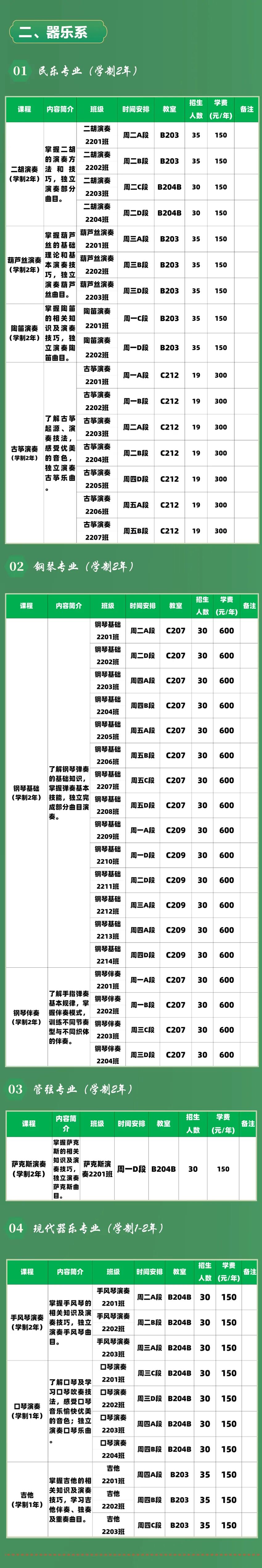 湖北省老年大学2022年招生简章 湖北省老年大学是由省委组织部主管、省委老干部局主办,具有教学、活动、培训功能的离退休干部(职工)学习活动阵地。学校位于东湖之滨、省博物馆旁。根据常态化疫情防控要求,结合我校实际,启动2022年招生报名工作,现将主校区及洪山侧路校区招生具体事宜安排如下: 一、招生对象 省直单位退休人员,社会老人(女50周岁以上、男55周岁以上,不超过80周岁),身体健康。 二、招生系、专业 1.声乐系:声乐基础专业、声乐表演专业。 2.器乐系:民乐专业、钢琴专业、管弦专业、现代器乐专业。 3.舞蹈系:形体舞专业、民族民间舞专业、古典舞专业。 4.体育系:太极拳专业、棋牌专业、健身专业、体育舞蹈专业。 5.书法美术系:书法专业、国画专业、西洋画专业、视觉艺术专业。 6.文史哲系:文学欣赏专业、文学创作专业、汉语言专业、英语专业、历史专业。 7.戏曲表演系:京剧专业、地方戏曲专业。 8.实用技能系:烹饪专业、茶艺专业、手工艺专业、美妆专业、中医保健专业、珠宝鉴赏专业。 9.信息技术系:计算机专业、智能手机专业。 三、开学时间及上课时段 1.开学时间 2022年3月7日(星期一) 2.上课时段 A时段上课时间8:30至10:00; B时段上课时间10:20至11:50; C时段上课时间14:00至15:30; D时段上课时间15:50至17:20。 一学年分为两学期,每学期16周,共32周,每周上课1次,每次2学时,1.5个小时(含课间休息10分钟),各班具体上课时间详见课程表。课后各教学场地封闭消毒。 四、报名办法 本学年招生分为荆楚乐龄APP报名和线上缴费两个阶段。具体安排如下: 第一阶段:荆楚乐龄APP报名 1.省直单位退休人员 报名时间:2022年2月23日9:00至2月24日22:00 2.非省直人员 报名时间:2022年2月25日9:00至2月28日22:00 报名流程:下载“荆楚乐龄APP”→注册登录→进入“我的信息”进行实名认证→点击“网上报名”,选择相应班级进行报名。 第二阶段:线上缴费 缴费时间:2022年3月1日9:30至3月2日22:00 缴费流程:详见湖北省老年大学微信公众号。 五、就学要求 1.学员凭行程码、健康码、测体温、戴口罩出入校园; 2.学员就学期间严禁前往中高风险地区; 六、注意事项 1.学员应身心健康,具有完全行为能力,不接受患有精神类、传染类疾病人员报名。 2.报名前请认真阅读《招生简章》,根据本人健康状况、学习基础、上课时间等因素慎重选择课程、班级,每人最多可报2门课程。 3.学员在荆楚乐龄APP上报名后,须在指定时间内完成线上缴费,否则视为自动放弃。 4.学校实行学年制招生,按年度收费(不含教材及讲义资料费)缴费后学费将转入财政专户,不予退费,学费收费收据开学后统一办理。 5.学员报名时应认真如实填写“荆楚乐龄”APP认证信息,确保个人信息完整、真实。在校期间应遵守《学员守则》和学校相关管理规定,所报课程仅限本人就读,不得私自转让,否则后果自负。 6.报名期间学校将在一楼大厅和103教室设报名咨询点。 7.主校区(武昌区东湖路158号)地下停车场面向学员免费停车2小时/天,超出部分按5元/小时收费。乘车路线:地铁8号线省博湖北日报站(黄鹂路地下通道出口);公交14路、552路、701路东湖路省博物馆(后站)。 8.洪山侧路校区(武昌区洪山侧路10号)招生仅面向水果湖地区老同志,校区不提供停车位,上课请绿色出行。乘车路线:地铁8号线洪山路站(B出口);公交522路、552路、587路、606路、817路洪山侧路东三路站。 9.从本学年起学校将进一步规范学籍管理,所有招生班级统一规范为“XX课程XX(入学年度)XX班”(如:声乐基础2201 代表声乐基础课程2022年入学01班)。 七、报名咨询电话 教学管理处: 027-88161006 袁老师 027-88161042 秦老师 027-88161019 雷老师 027-88161035 张老师 027-88161008 侯老师 027-88161022 张老师 027-88161031 夏老师 027-86778978 刘老师 注:如有增加班级和调整班级见招生补充通知。 湖北省老年大学 2022年2月 点击下方表格 可以放大观看 ▼ 点击下方表格 可以放大观看 ▼ (点击标题,即可查看文章) 投稿邮箱:hbslndx@163.com 来源:教学管理处 通讯员:袁媛 分享 点赞 在看
