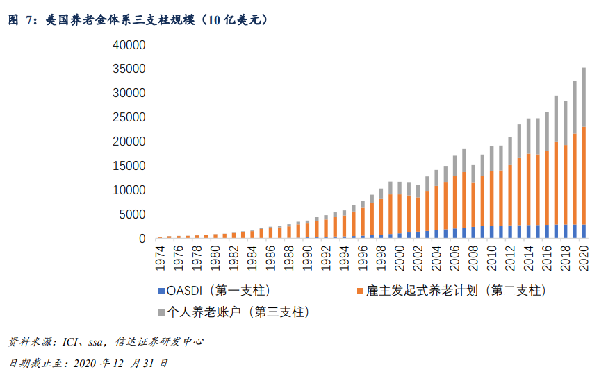 第一支柱2.9万亿美元,占比7.7%并逐年下滑;第二支柱20.1万亿美元,占比53.3%;第三支柱14.7万亿美元,占比39%。