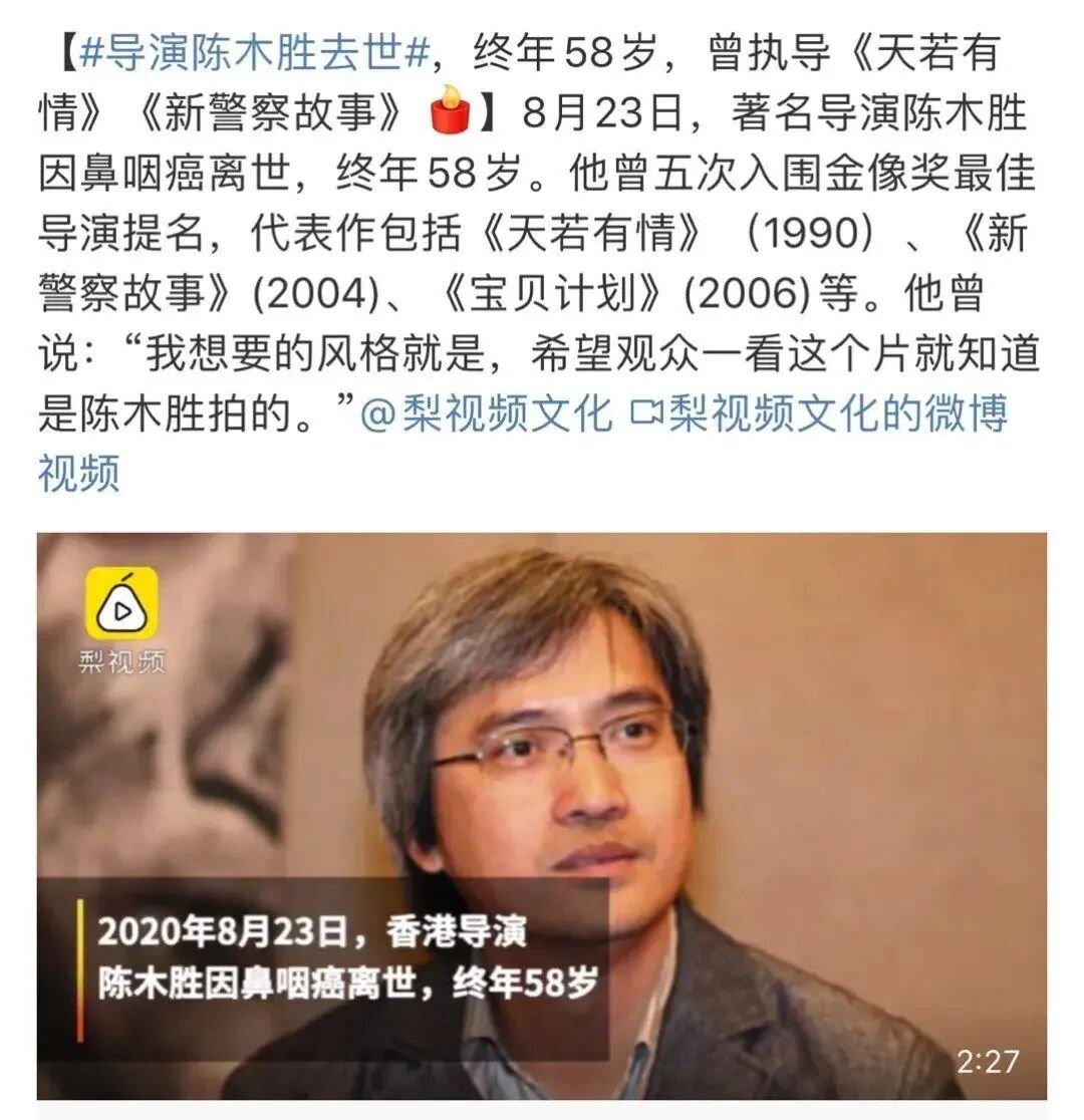 肥胖人口即将达到3.25亿,20年后将增长一倍1.5亿人患有皮肤病沿海城市毕业生视力低下率85%38.2%的中国人患有各类睡眠障碍每天约有10000人确诊癌症中国肠胃病患者有1.2亿,慢性胃炎发病率为30%……当你拿生命健康开玩笑的时候,病魔正忙着侵蚀你的身体。这世界,真的会惩罚不好好爱惜身体的人。前几年,香港著名导演陈木胜不幸因鼻咽癌离世,享年58岁。02