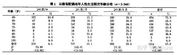 2001年发表在《中国妇幼保健》上的“云南省3346名老年人性生活特点及相关因素探讨”【3】指出,3346名老年人中,57.2%有性生活,每周1次以上者占6.4%,90岁以上的男性9.5%仍有性生活。