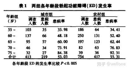 2004年发表在《中国老年学杂志》上的“老年人性生活现状调查与分析”【1】研究了宜昌1167例55-75岁男性的性生活,结果表明ED随着年龄增长而增加,每个年龄段的农村人口都比城市人口ED比率高,但差别不显著。