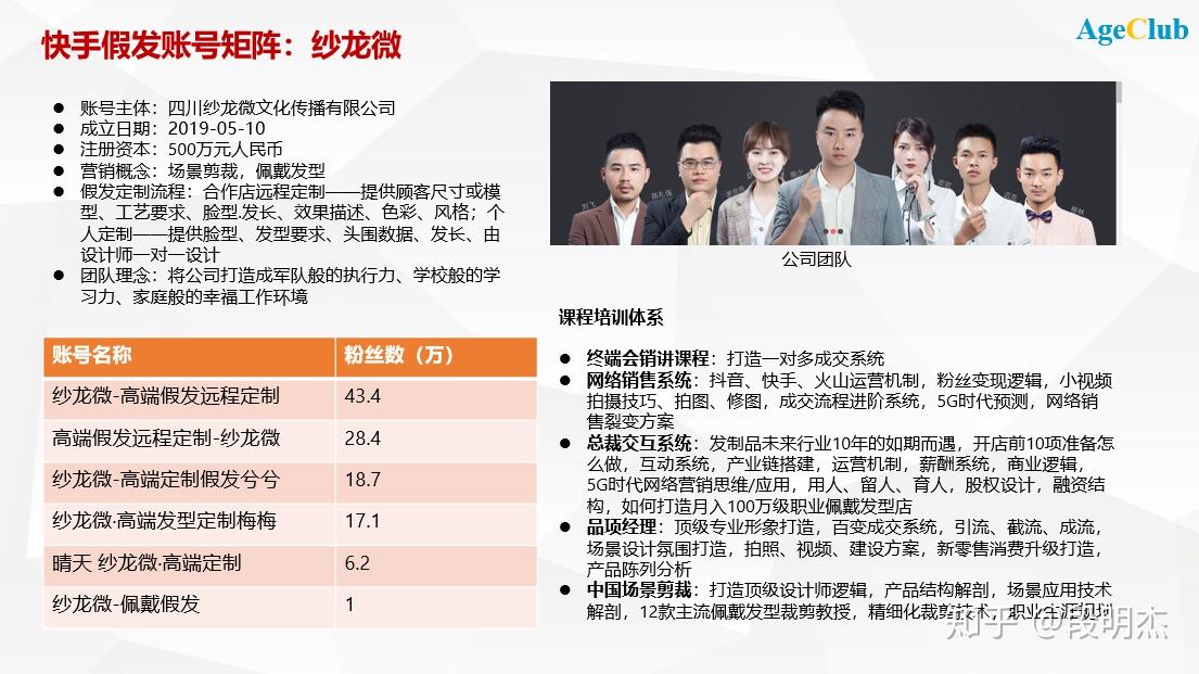 而快手账号矩阵“纱龙微”采用成熟的微商模式,创造出新概念“佩戴发型”和“场景剪裁”来解除普通消费者对假发的抗拒心理,通过短视频/直播在全网招募假发合伙人,承诺可以提供完善的课程培训体系;