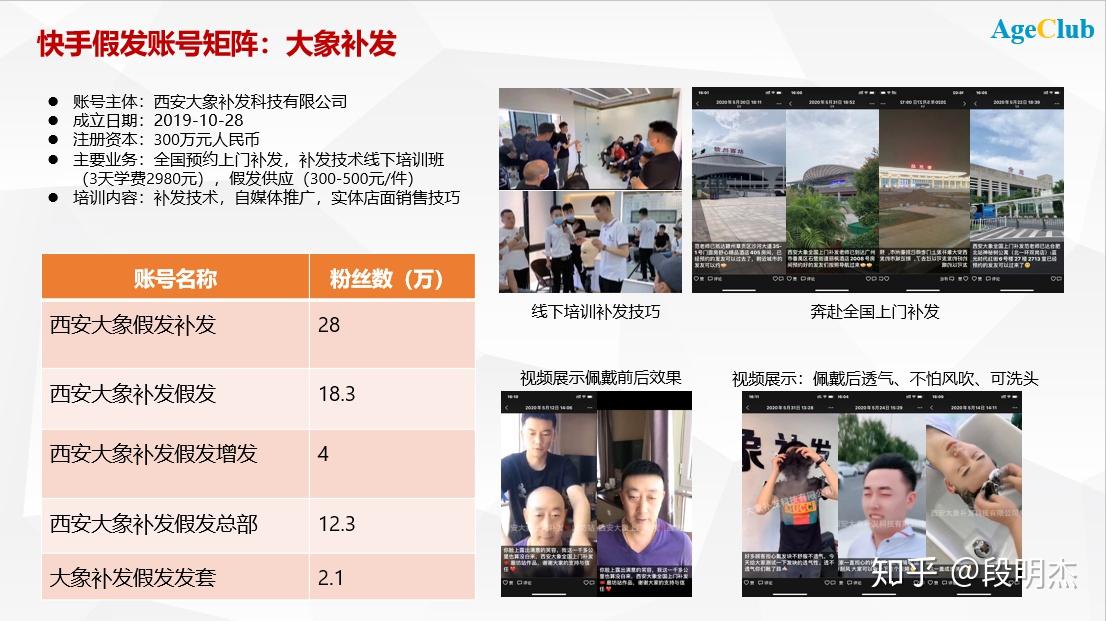 另一个名为“大象补发”的快手账号矩阵,一方面为C端用户提供全国上门补发的服务,另一方面也为向创业、开店的B端用户提供线下培训和假发原材料供应。