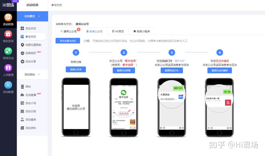 另外Hi现场直播还有一大特色,店家可将直播参与码设置为自有公众号二维码。这样用户才参与直播的时候即可自动关注店家的自有公众号,实现引流。