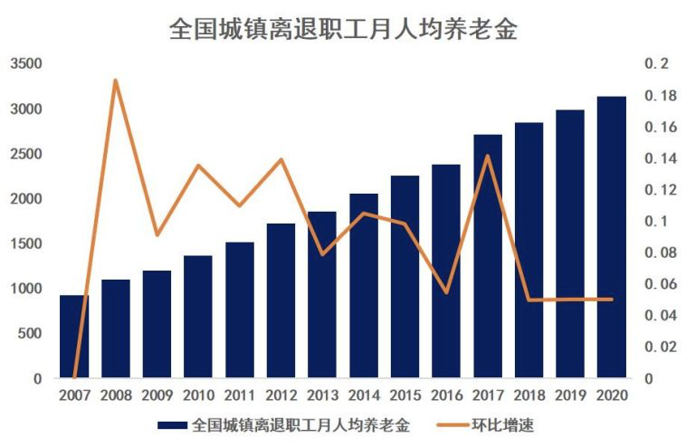 据中研普华研究报告,从2005年到2021年,我国养老基金已经连续17年上涨,2005年退休人员的平均养老金水平是714元,到2021年已接近3000元。