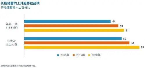 不过年轻一代中,有养老意识的人越来越多,近三年年轻一代(18-34岁)开始进行长期储蓄的比例越来越高,2018至2020分别为44%、48%、51%。