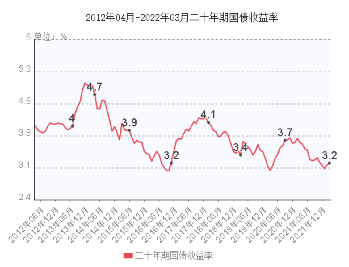 截止2022年03月3日,二十年期国债收益率为3.22%。