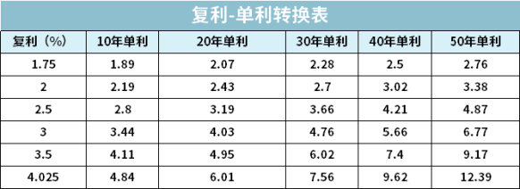 比如3.5%的复利约等于30年每年6.02%的单利,约等于40年每年7.4%的单利。
