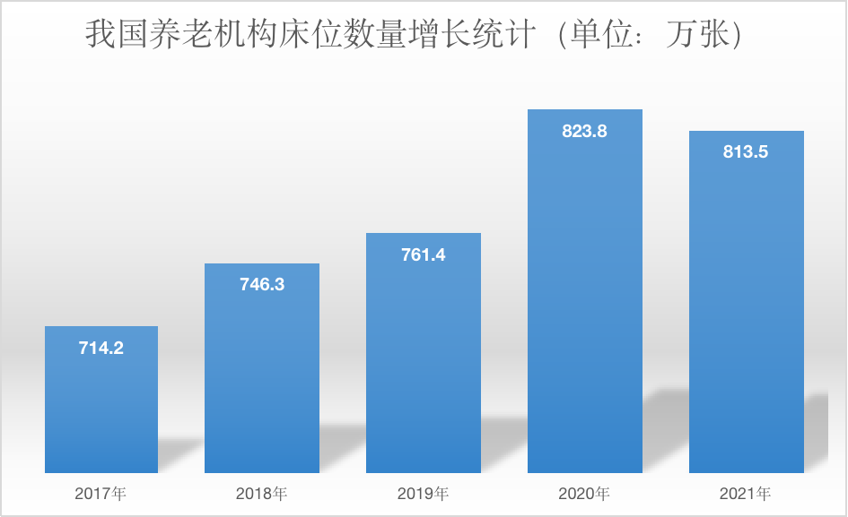 国家统计局历年《统计公报》显示,2017年养老服务床位714.2万张,2018年养老服务床位746.3万张,2019年养老服务床位761.4万张,2020年养老服务床位823.8万张,2021年养老服务床位813.5万张。
