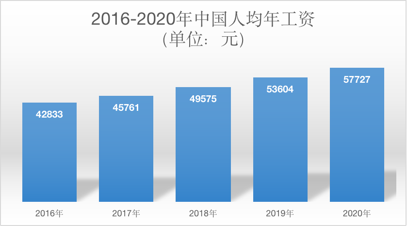 2020年,我国人均年工资57727元,人均平均月工资4810.6元。