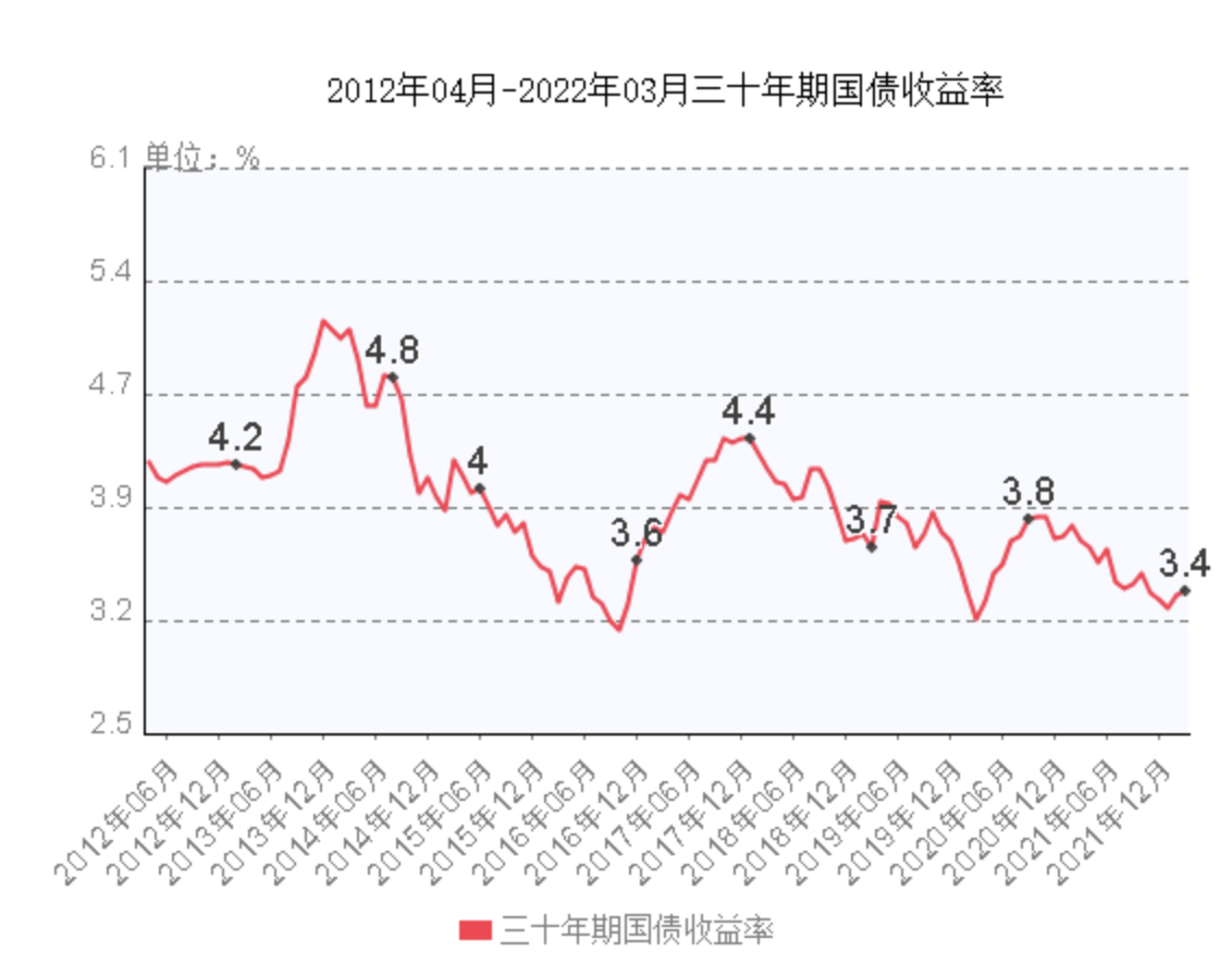 截止2022年03月3日,三十年期国债收益率为3.39%。
