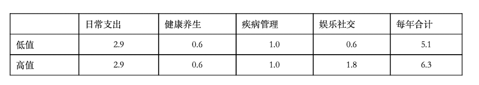 在不考虑通胀的情况下,从60岁退休后到80岁一共需要准备的养老资金等于每年总支出*20(年),算得结果落在[102万元,126万元]。也就是说,即使忽略通胀,仍需要准备百万以备养老。