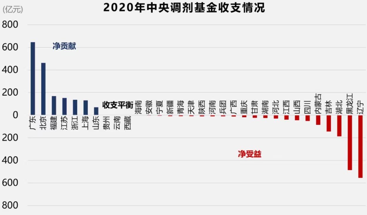 以2020年为例,全国(不含港澳台)共有7个省份上缴金额大于下拨金额,3个省份收支平衡,其余21个省份相对困难,需要支援。