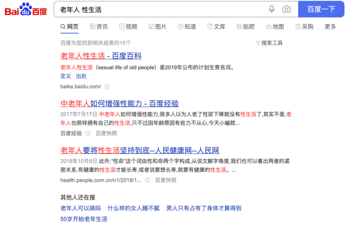 在度娘上搜索「老年人性生活」这两个关键字,页面上只有15个相关结果。看来大家对老年人的性生活真的很不关注。