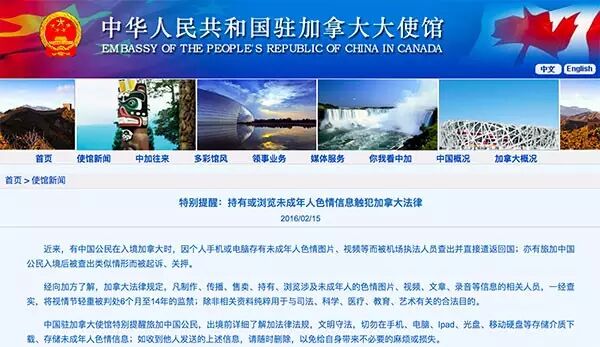 加拿大边境服务局官方网站上确实写道,过境者在通关时有可能会被要求进入“辅助服务和检查区”,在这里工作人员将对过境者的行李、钱包、电子设备、交通工具及搭载物品进行检查。而中国驻加拿大大使馆也在当地时间2月15日在其网站上做出“特别提醒”:持有或浏览未成年人色情信息触犯加拿大法律。