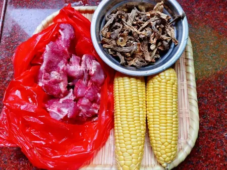 3.准备一个干净的锅,将玉米还有鹿茸菇放在盆中,肉洗净后也倒入。往里面加入适量的水,然后盖上盖子焖煮1.5小时。我们就很喜欢煮汤,一方面是因为做法简单,还有就是营养滋补。