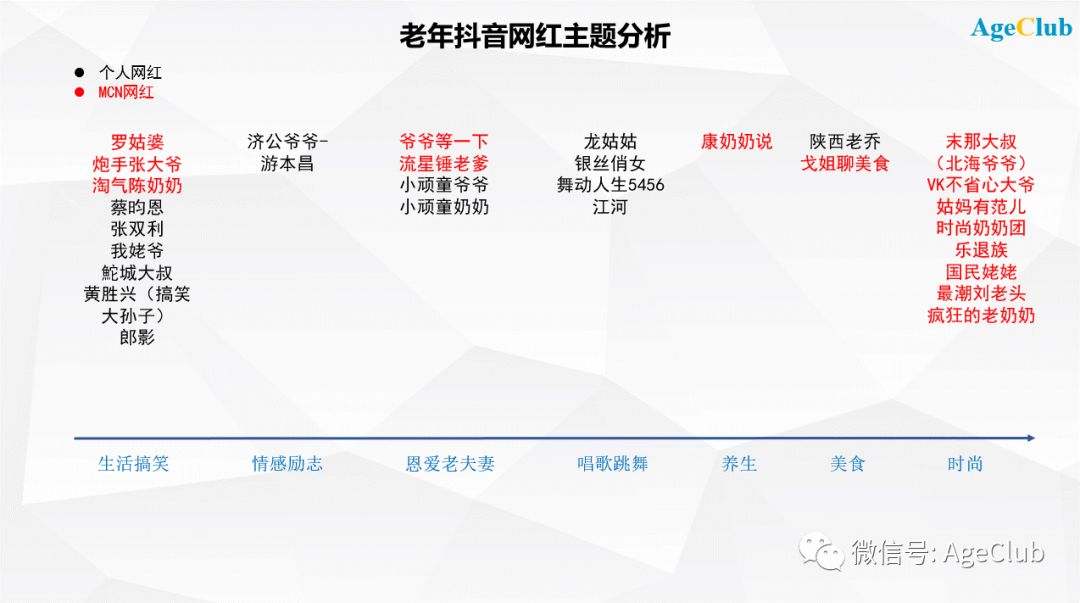 而大半年过去了,这样的情况并没有得到明显改观,涨粉显著的中老年网红大多仍是主打泛年龄人群的情感、搞笑、时尚主题,专门为中老年人群做定制化内容的账号仍然很稀缺。