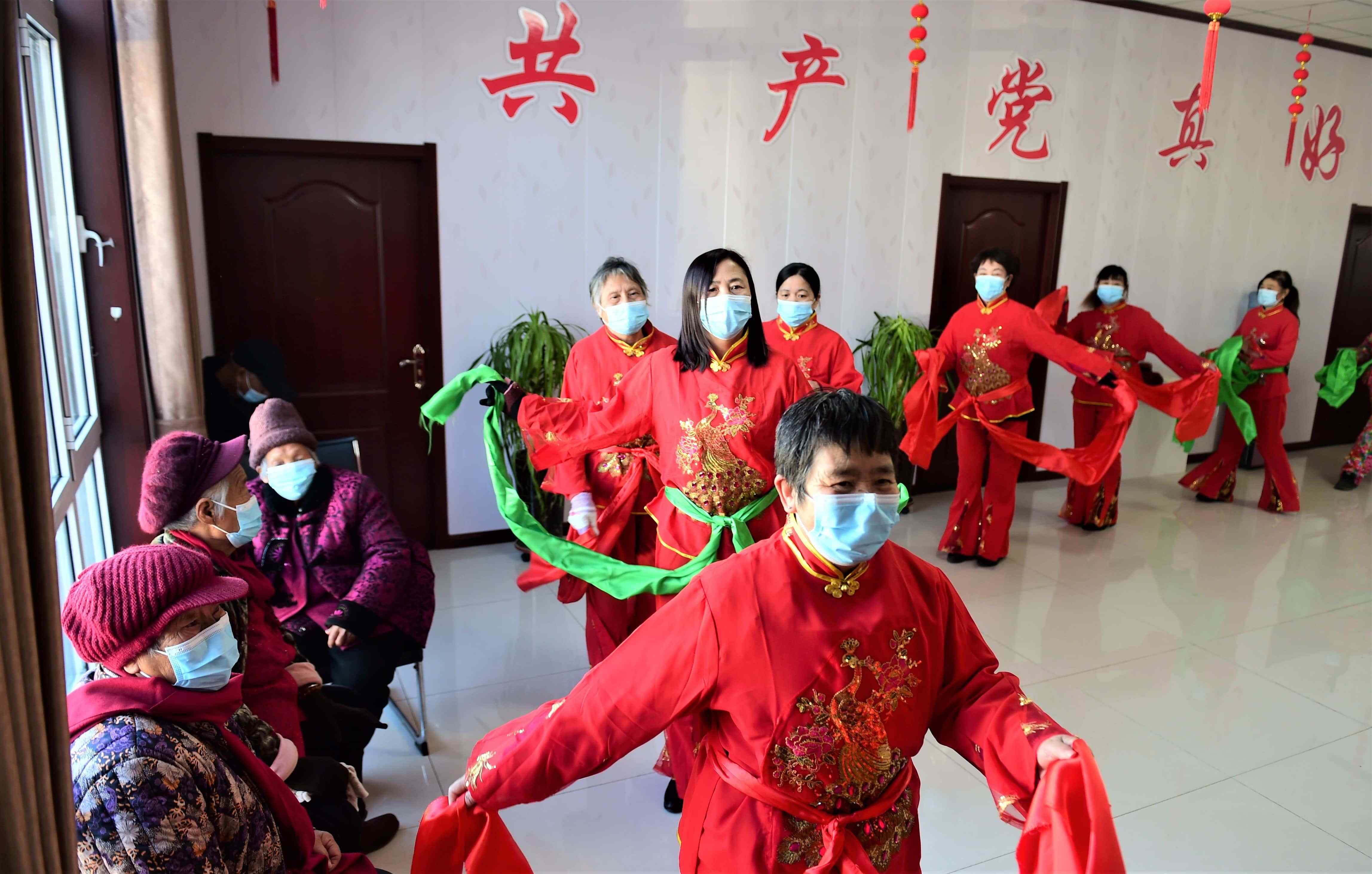 12月26日,青县人和镇村的志愿者为老人表演秧歌。新华社记者 王民 摄
