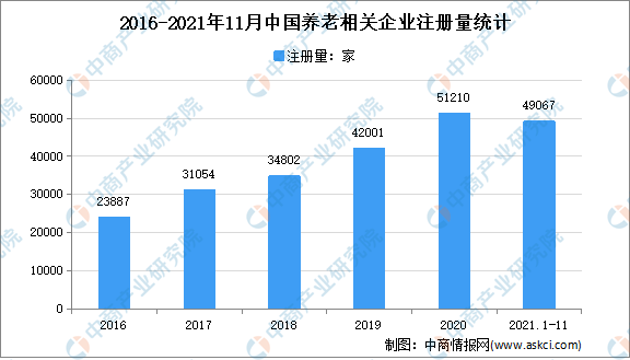 政策推动下,大批养老相关企业涌现。企查查数据显示,近10年养老相关企业金时族注册量逐年攀升,2019年注册量超到4.2万家,同比增长21%。2020年注册量超5.1万家,同比增长22%。2021年1-11月共新增超4.9万家养老相关企业,同比增长19%。