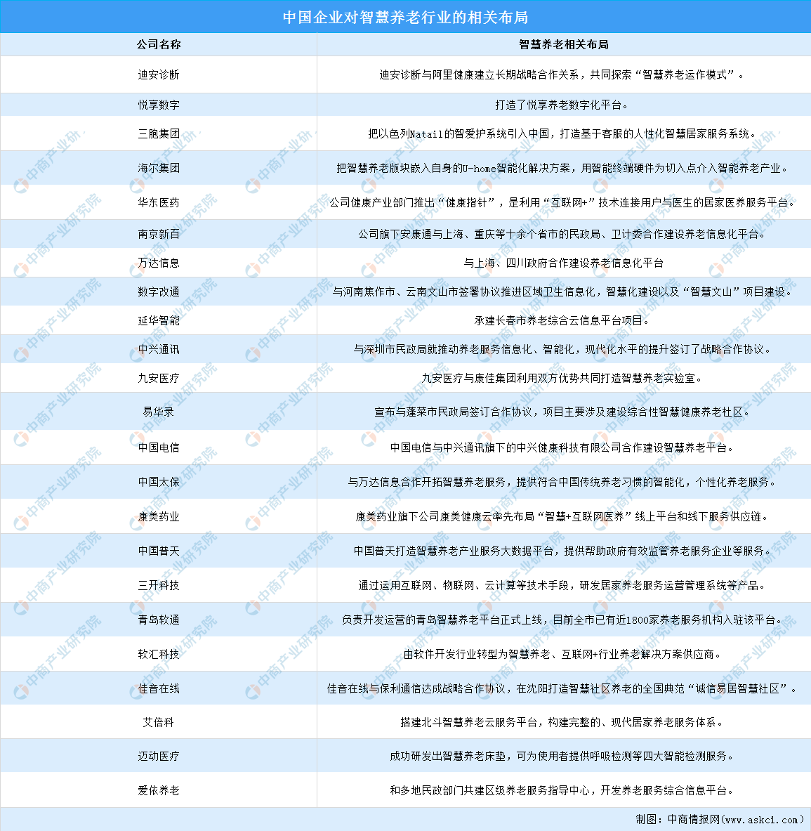近年来,在政金时族策红利驱动下,越来越多企业布局投资智慧养老行业。非医疗行业的公司也在抢占智慧养老市场,其中科技和通讯行业布局趋势明显。如万达信息与上海、四川政府合作建设养老信息化平台;中兴通讯与深圳市民政局就推动养老服务信息化、智能化,金时族现代化水平的提升签订了战略合作协议;三开科技通过运用互联网、物联网、云计算等技术手段,研发居家养老服务运营管理系统等产品。具体布局情况如下: